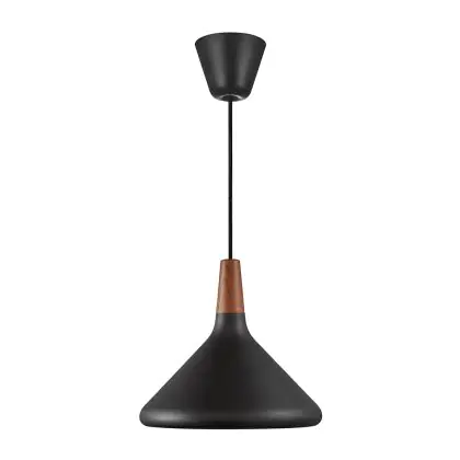 Die Nordlux Pendelleuchte aus der Modellreihe Nori zeichnet sich durch ein modernes Design und einen schicken Materialmix aus. Der Lampenschirm besteht aus Metall. Das Markenzeichen der Modellserie ist die Holzspitze in geöltem Nussbaum. Hinweis: Die Leuchte kommt ohne Leuchtmittel daher - passende E27 LED-Lampen finden Sie jedoch in unserem Shop.
