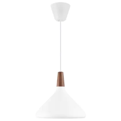 Die Nordlux Pendelleuchte aus der Modellreihe Nori zeichnet sich durch ein modernes Design und einen schicken Materialmix aus. Der Lampenschirm besteht aus Metall. Das Markenzeichen der Modellserie ist die Holzspitze in geöltem Nussbaum. Hinweis: Die Leuchte kommt ohne Leuchtmittel daher - passende E27 LED-Lampen finden Sie jedoch in unserem Shop.