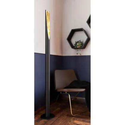 Die Eglo Stehlampe Barbotto kombiniert modernes Design mit funktionaler Beleuchtung. Ihr schlanker Stahlkörper in Schwarz mit goldfarbener Innenseite sorgt für eine elegante Lichtwirkung. Mit einer Leistung von 4,5 W und einem Lichtstrom von 345 lm bietet sie ein warmweißes Licht mit einer Farbtemperatur von 3.000 Kelvin, ideal für eine gemütliche Atmosphäre in Ihrem Zuhause.