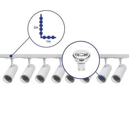 Beschreibung Komplettset 1-Phasen Rail L 1 x 2 Meter Weiß | incl. 8x Spot + GU10 2700K 3W Dimmbar + Abschlusskappe, Stromanschluss und L -Verbinder