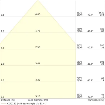 Beispiel: Wird eine Lampe mit einem Abstrahlwinkel von 60 Grad an der Decke (2,5 m Höhe) angebracht, erzeugt sie einen Lichtkegel von 2,9 Metern Durchmesser. Hat die Lampe hingegen einen Abstrahlwinkel von 120 Grad, beträgt der Lichtkegel 8,7 Meter im Durchmesser. |