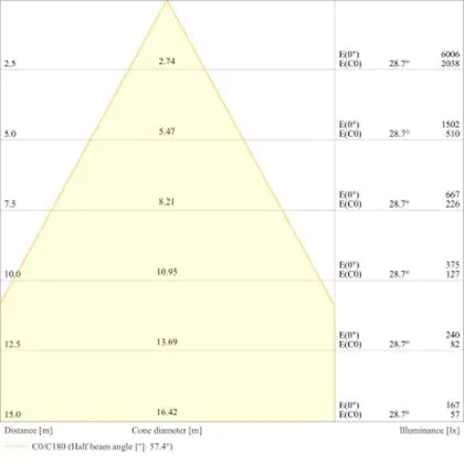 Beispiel: Wird eine Lampe mit einem Abstrahlwinkel von 60 Grad an der Decke (2,5 m Höhe) angebracht, erzeugt sie einen Lichtkegel von 2,9 Metern Durchmesser. Hat die Lampe hingegen einen Abstrahlwinkel von 120 Grad, beträgt der Lichtkegel 8,7 Meter im Durchmesser. |