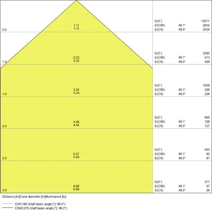 Beispiel: Wird eine Lampe mit einem Abstrahlwinkel von 60 Grad an der Decke (2,5 m Höhe) angebracht, erzeugt sie einen Lichtkegel von 2,9 Metern Durchmesser. Hat die Lampe hingegen einen Abstrahlwinkel von 120 Grad, beträgt der Lichtkegel 8,7 Meter im Durchmesser. |