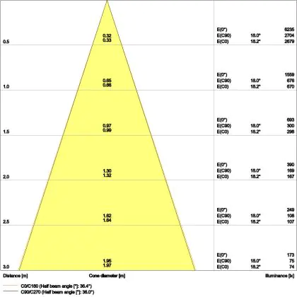 Beispiel: Wird eine Lampe mit einem Abstrahlwinkel von 60 Grad an der Decke (2,5 m Höhe) angebracht, erzeugt sie einen Lichtkegel von 2,9 Metern Durchmesser. Hat die Lampe hingegen einen Abstrahlwinkel von 120 Grad, beträgt der Lichtkegel 8,7 Meter im Durchmesser. |