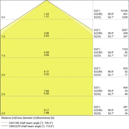 Beispiel: Wird eine Lampe mit einem Abstrahlwinkel von 60 Grad an der Decke (2,5 m Höhe) angebracht, erzeugt sie einen Lichtkegel von 2,9 Metern Durchmesser. Hat die Lampe hingegen einen Abstrahlwinkel von 120 Grad, beträgt der Lichtkegel 8,7 Meter im Durchmesser. |