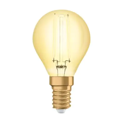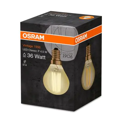 Die Osram Vintage 1906 LED E14 P45 4.5W 825 Gold | Ersetzt 36W ermöglicht enorme Energieeinsparungen von bis zu 90 %. Dank des Standard-E14-Sockels klappt der Umstieg auf LED besonders einfach. Die Goldbeschichtung und die sichtbaren Filamentstäbe im Inneren des Leuchtkörpers machen die Vintage-LED zu einem echten Highlight.